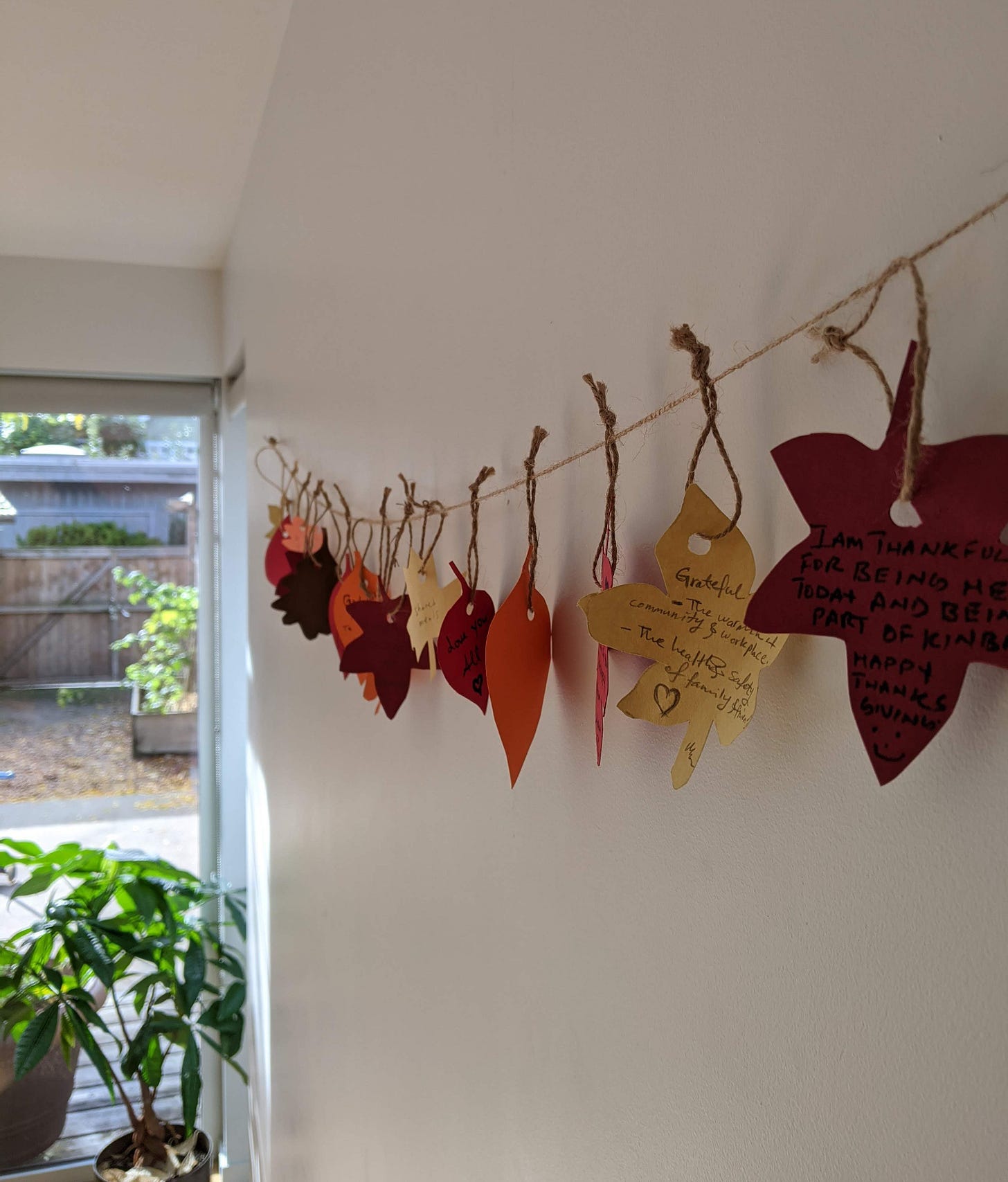 One tradition remained the same this year: at the end of the meal, with bellies full, we each wrote down our gratitude on a paper leaf, then took turns sharing around the table. At the end of the night all twenty leaves were strung up on the wall.